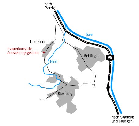 Von der Autobahn A8 Abfahrt Rehlingen/Siersburg in den Kreisel Richtung Rehlingen. Durch Rehlingen durchfahren (auf der Hauptstraße bleiben) und nach ca. 2 km vor Fremersdorf links abfahren, Richtung Eimersdorf. Am Ortseingang befinden Sie sich bereits auf der Römerstraße. Am Friedhof vorbei nach ca. 500 m finden Sie auf der rechten Seite mein Ausstellungsgelände.
